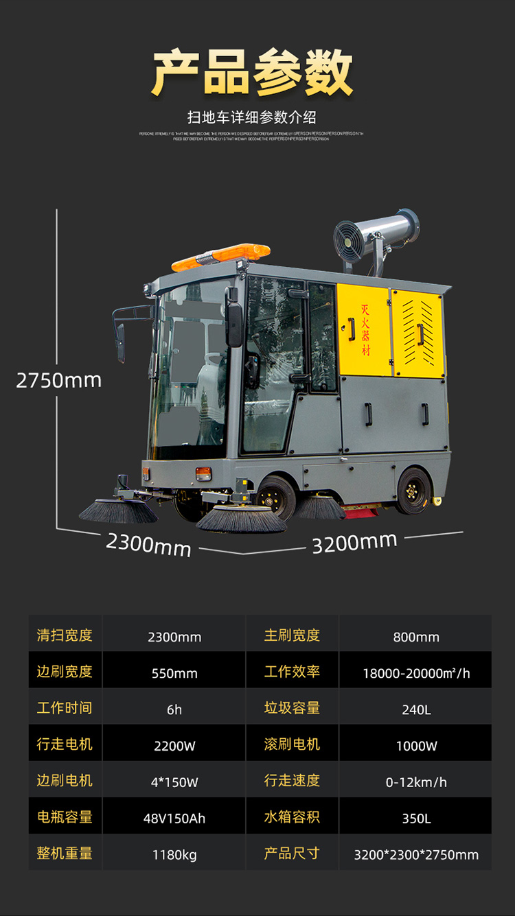莱特LT-G23型,全封闭四轮驾驶式扫地车,配备高压清洗和高压雾炮功能,清扫宽度2300mm,满电工作时间为4-6小时,工作效率20000㎡/h,采用的是200A锂电池,高压雾炮射程可达10米以上,可对作业环境高效的降尘,还可以用于绿植养护和环境消杀。高压水枪可以对地面顽固污渍进行清洁,还可以冲洗路牙石,为绿植浇水,工作之余,还可以用高压水枪清洗车辆。应用场景为:厂区、车间、公园、街道、物业小区、码头、学校、机场等需要大面积清扫的区域区域。
