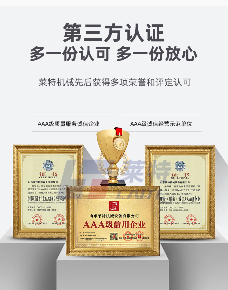 莱特LT-G50型全封闭四轮驾驶式扫地车,配备高压清洗和高压雾炮功能,清扫宽度2500mm,满电工作时间为6-8小时,工作效率25000㎡/h,采用的是8*200A免维护铅酸电池,高压雾炮射程可达10米以上,可对作业环境高效的降尘,还可以用于绿植养护和环境消杀。高压水枪可以对地面顽固污渍进行清洁,还可以冲洗路牙石,为绿植浇水,工作之余,还可以用高压水枪清洗车辆。应用场景为:厂区、车间、公园、街道、物业小区、码头、学校、机场、停车场、地下车库、充电站、加油站、公园工厂、工业园区等需要大面积清扫的区域区域。